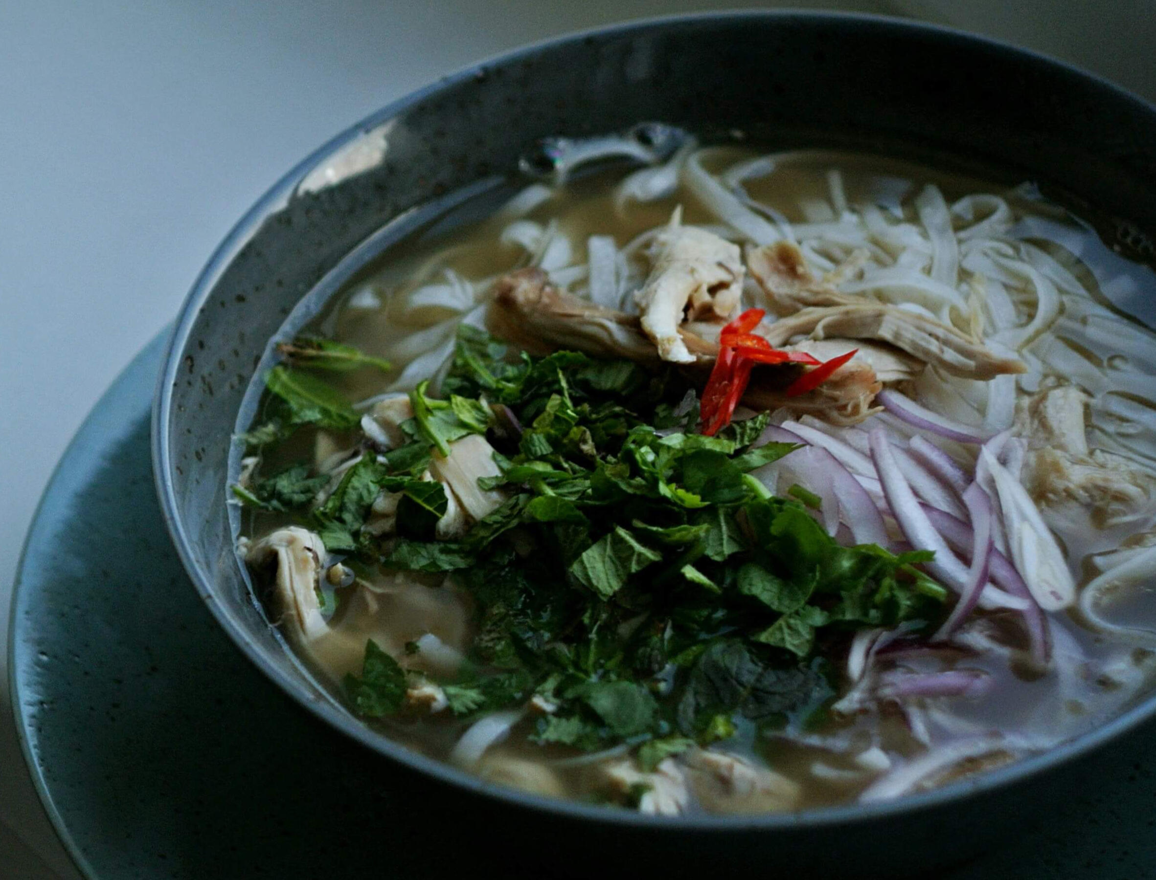 60 Traditionelle vietnamesische Pho-Suppe Reisbandnudelsuppe in würziger 9 Kräuterbrühe mit zartem Rinderfilet (wahlweise mit Hühnerbrustfilet), serviert mit frischen Koriander 18,90€
