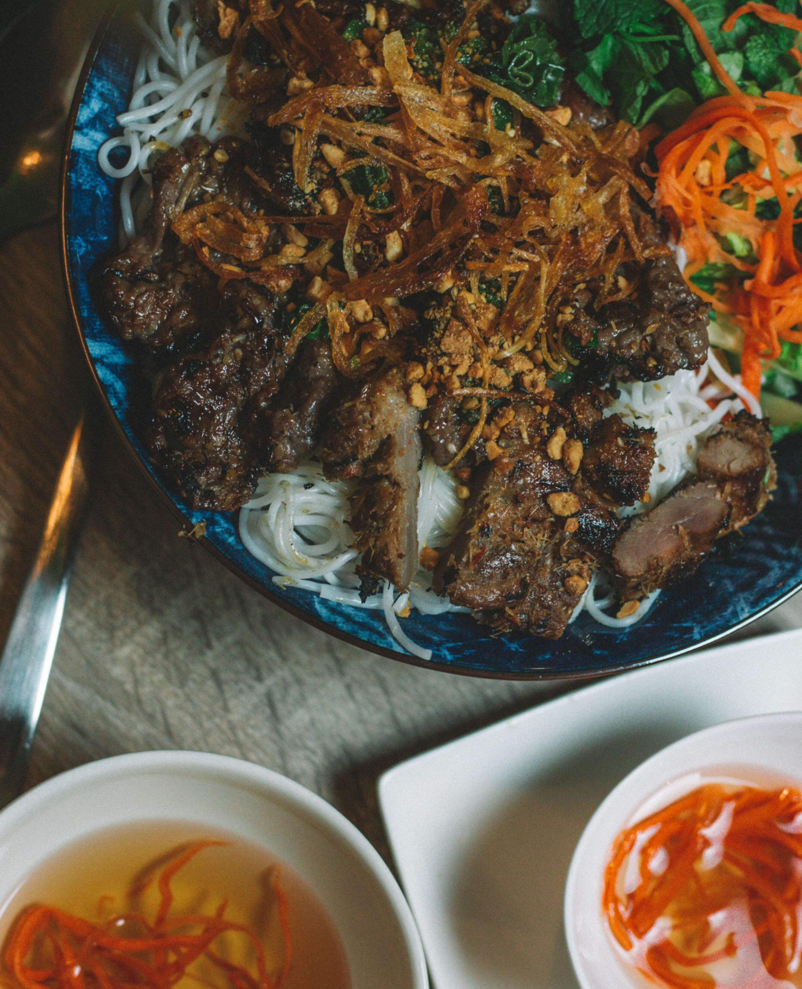 61 Bun Bo Das Gericht aus der südlichen Mekong-Delta-Region, zart gebratenes Rinderfilet mit Reisnudeln, serviert mit Salat, Erdnüsse und Röstzwiebeln dazu einer hausgemachten vietnamesischen Limetten-Fischsoße 18,90€